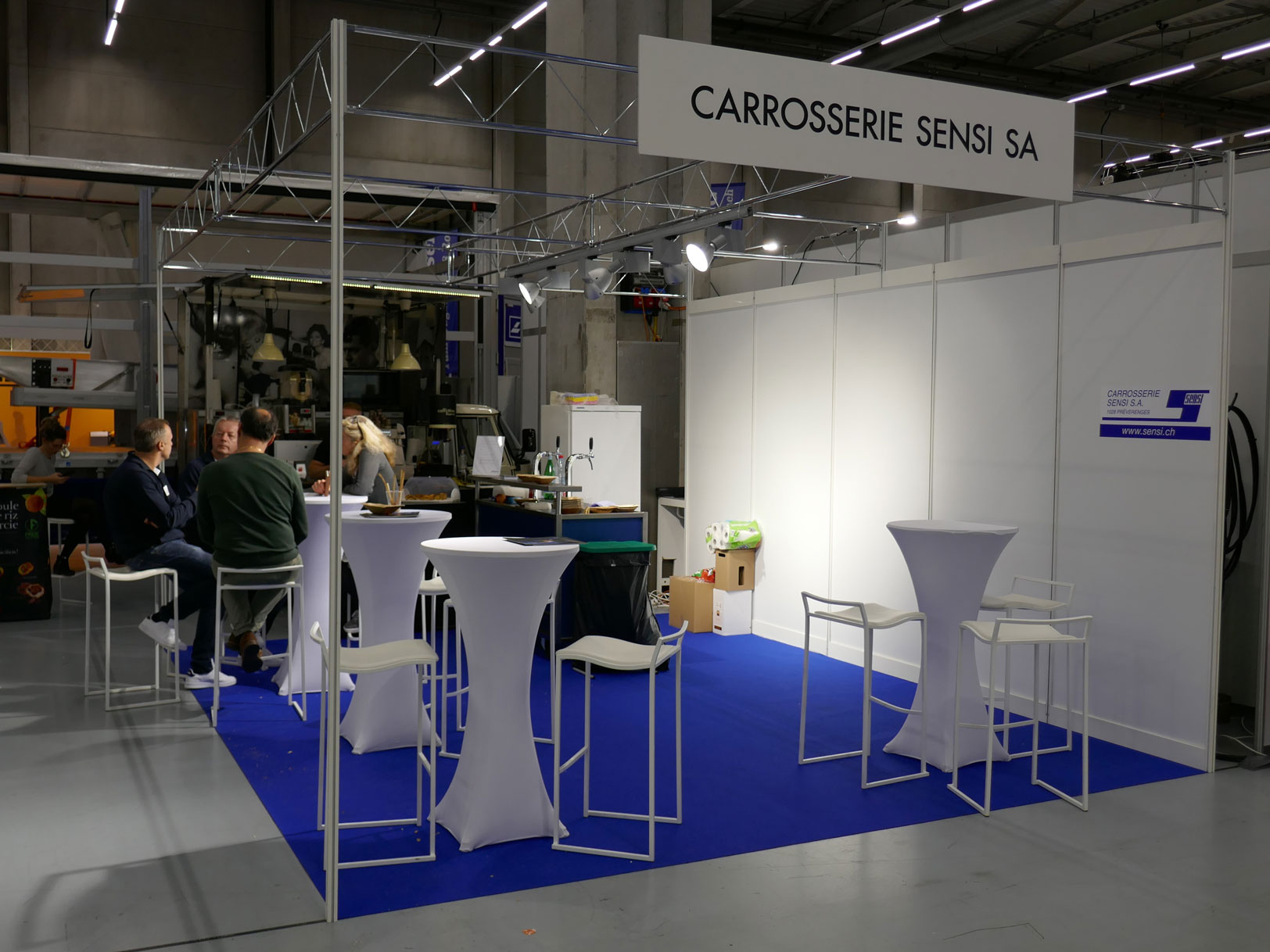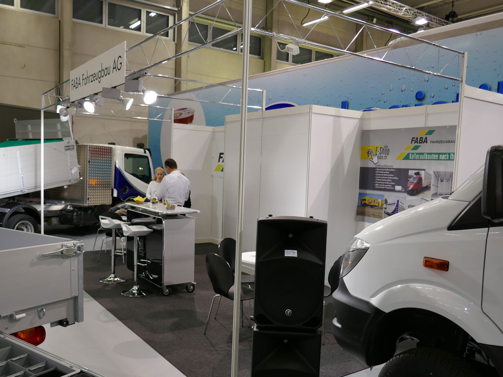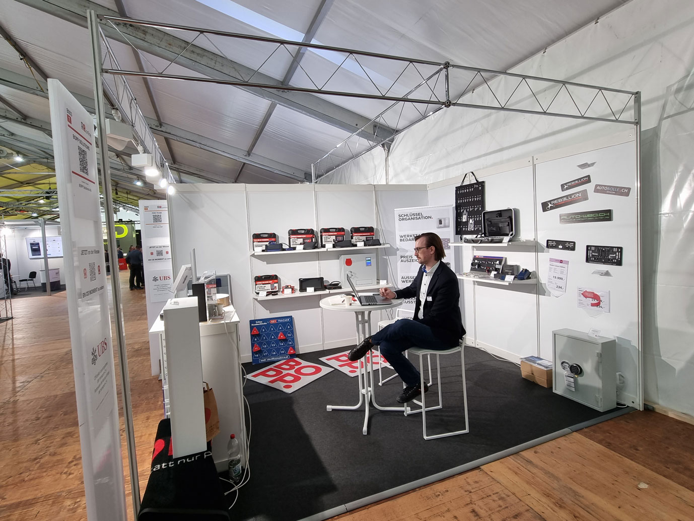 System und Wandelemente in weiss / Teppich anthrazit / Wandelemente OK 250cm, Gitterräger OK 275cm / Beleuchtung LED-Spot 25/200W (1 Stk. pro 3m² Standfläche) / Blendentafel weiss inkl. Beschriftung (max. 20 Buchstaben) 200x40cm