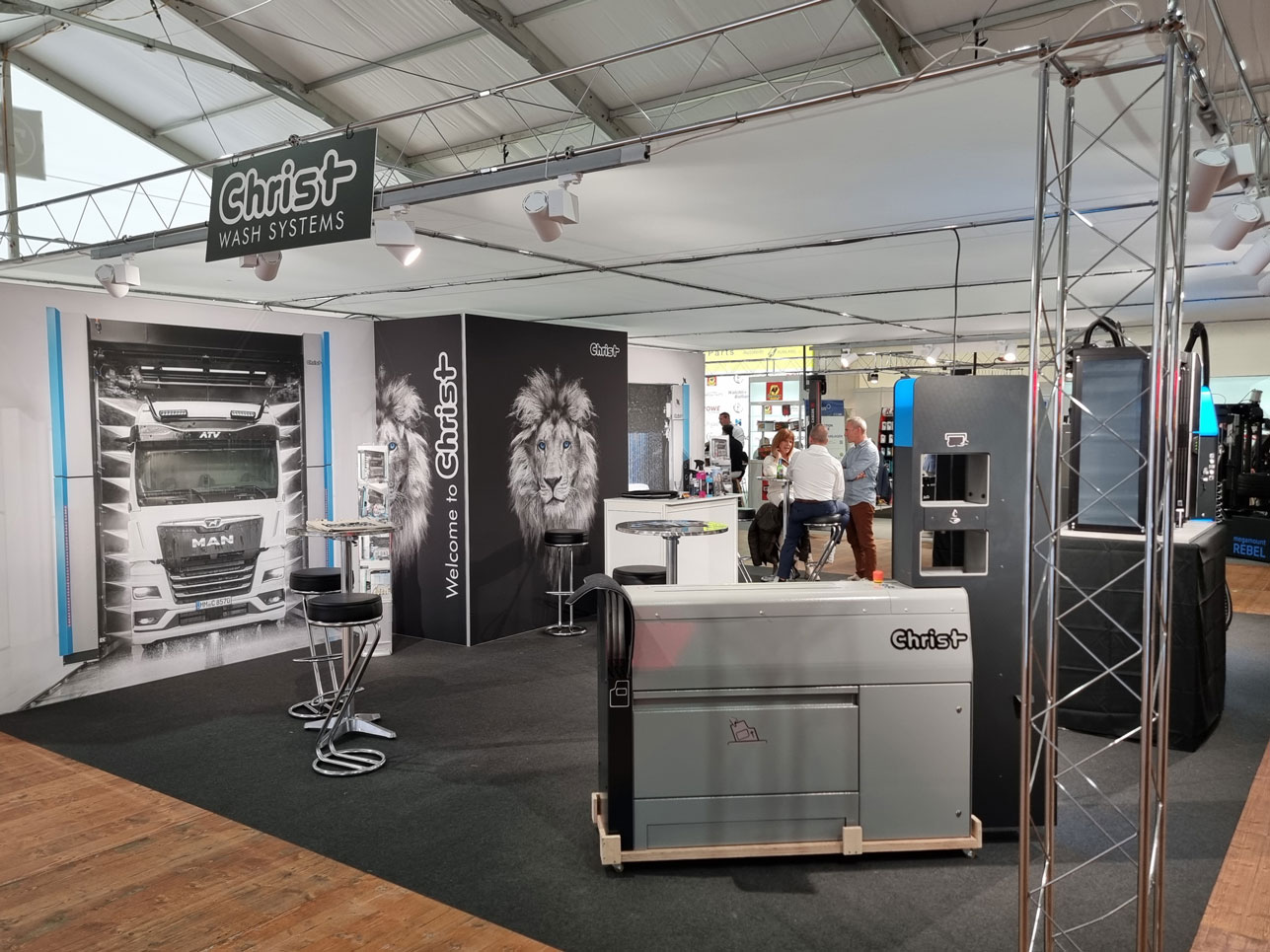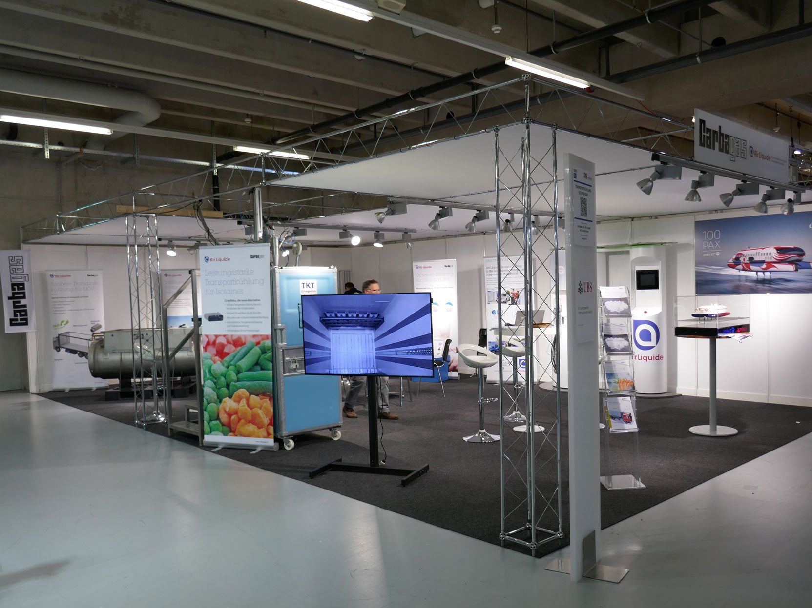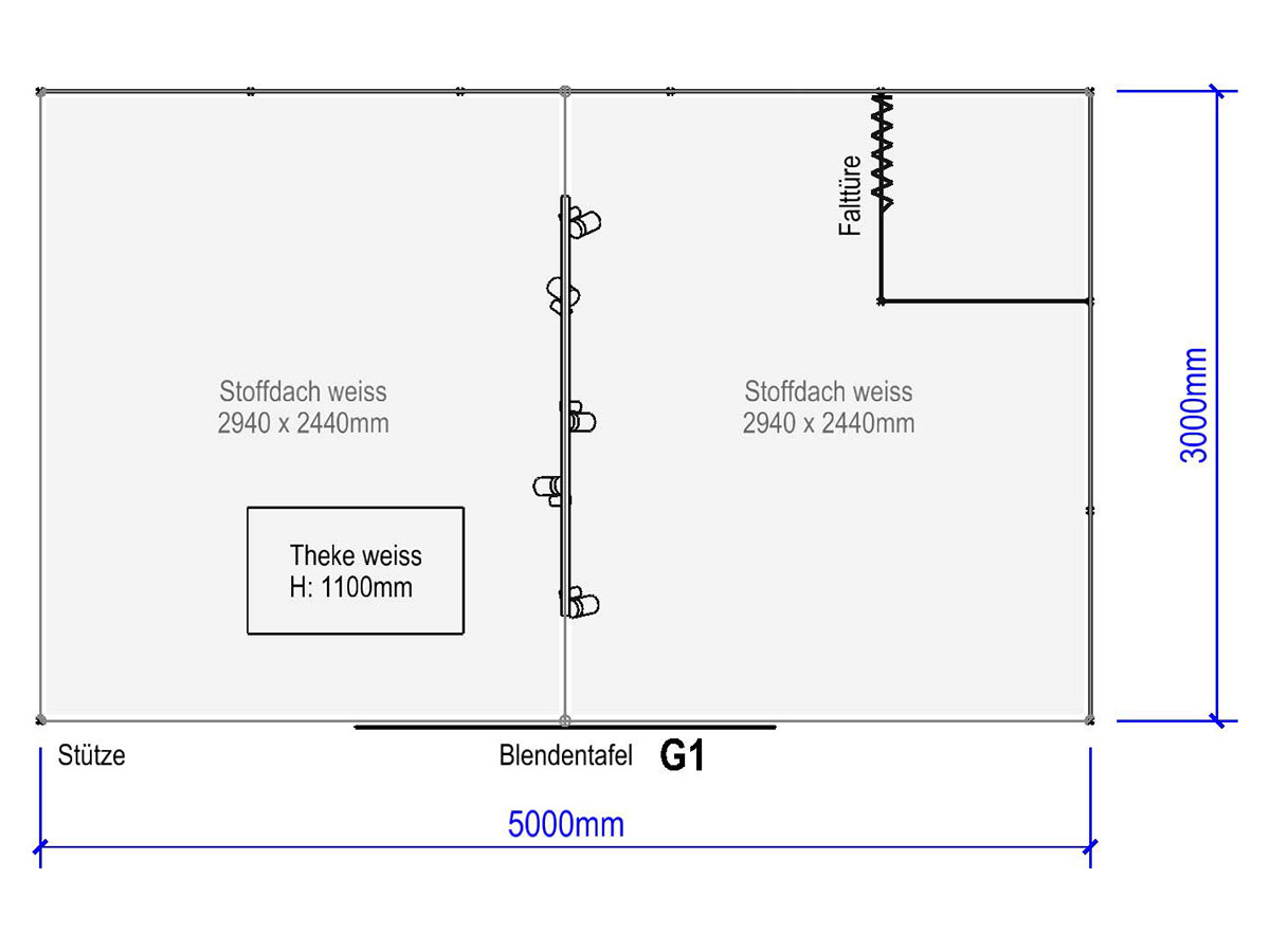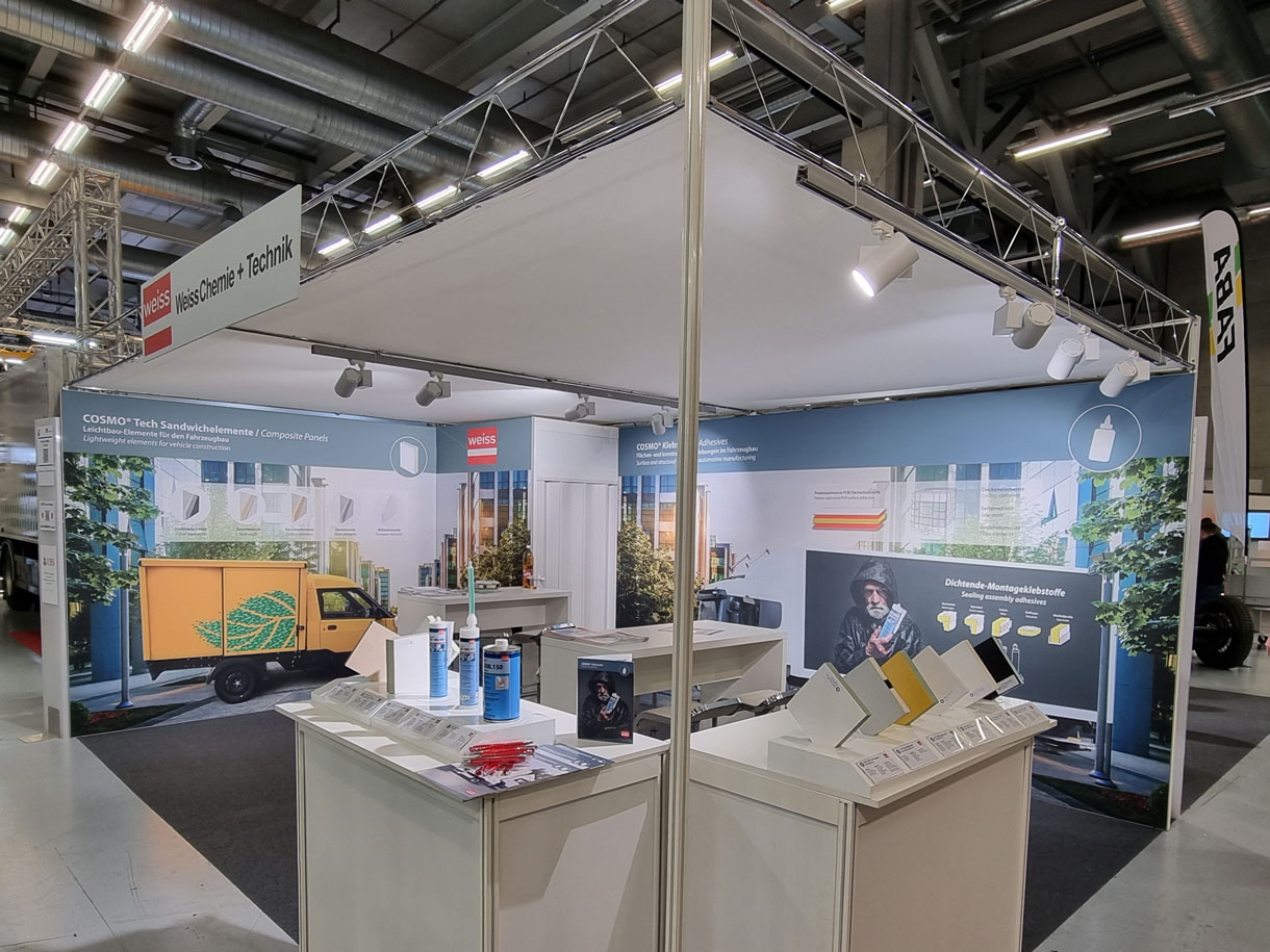 System und Wandelemente in weiss / Teppich nach Wahl, anthrazit, rot, blau, grau / Wandelemente OK 250cm, Gitterräger OK 275cm / Decke in Stoff weiss / Kabine 1m², mit Falttür abschliessbar / Theke weiss AN600, 103x53cm, Höhe 110cm / Beleuchtung LED-Spot 25/200W (1 Stk. pro 3m² Standfläche) / Blendentafel weiss mit Ihrem Original-Logo, 200x40cm
