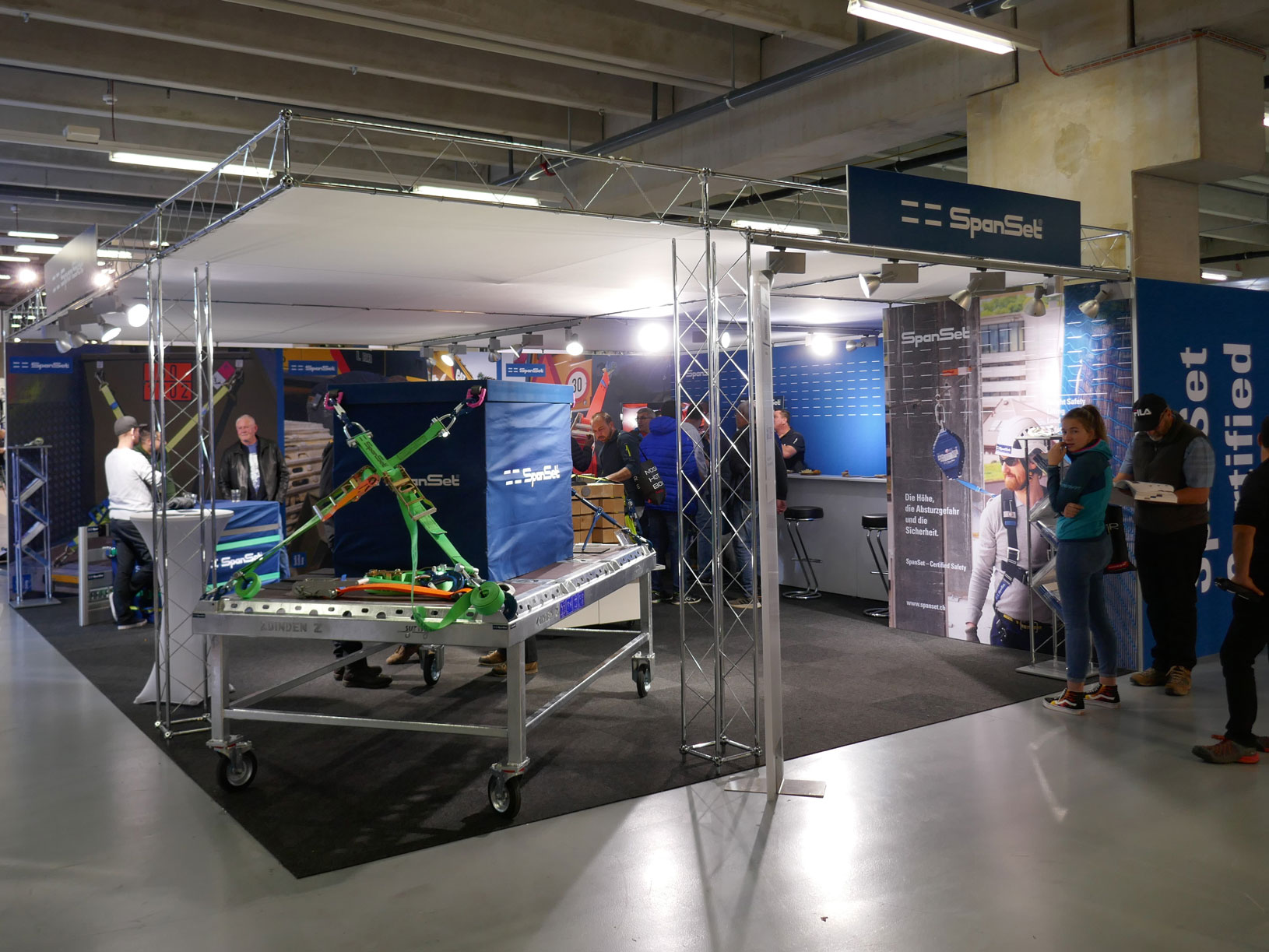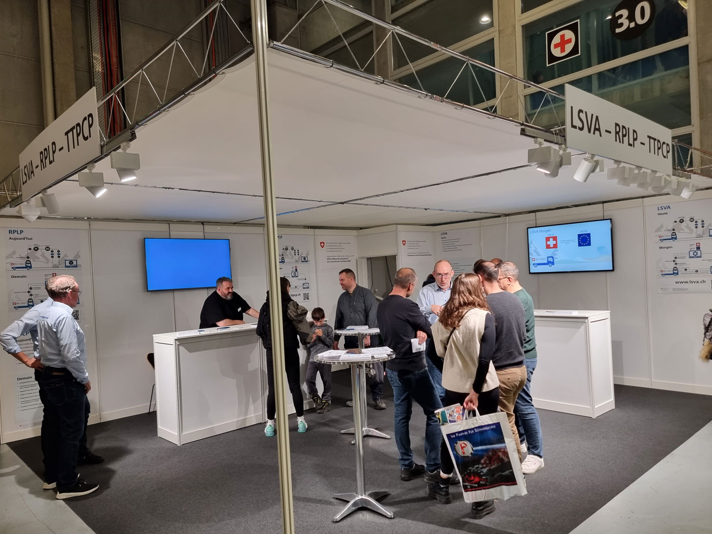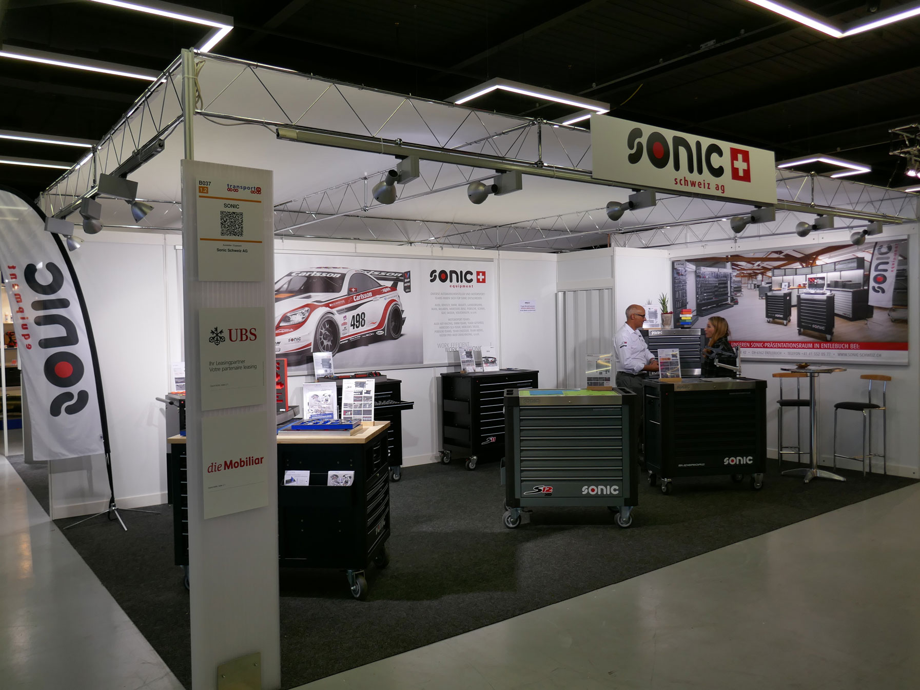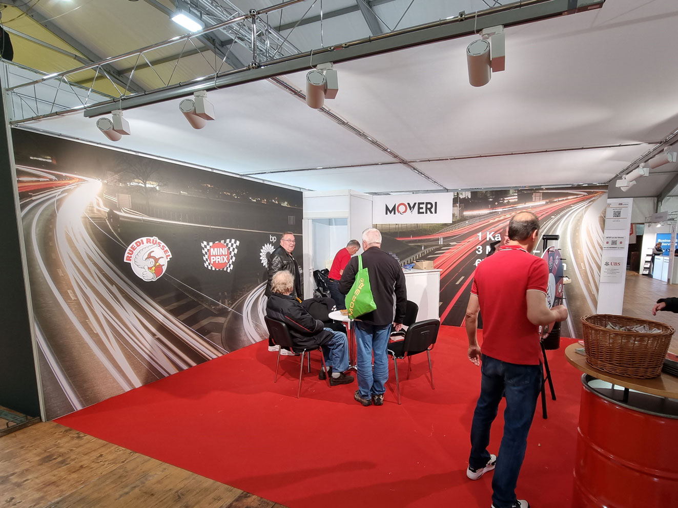 System und Wandelemente in weiss / Teppich nach Wahl, anthrazit, rot, blau, grau / Wandelemente OK 250cm, Gitterräger OK 275cm / Decke in Stoff weiss / Kabine 1m², mit Falttür abschliessbar / Theke weiss AN600, 103x53cm, Höhe 110cm / Beleuchtung LED-Spot 25/200W (1 Stk. pro 3m² Standfläche) / Blendentafel weiss mit Ihrem Original-Logo, 200x40cm