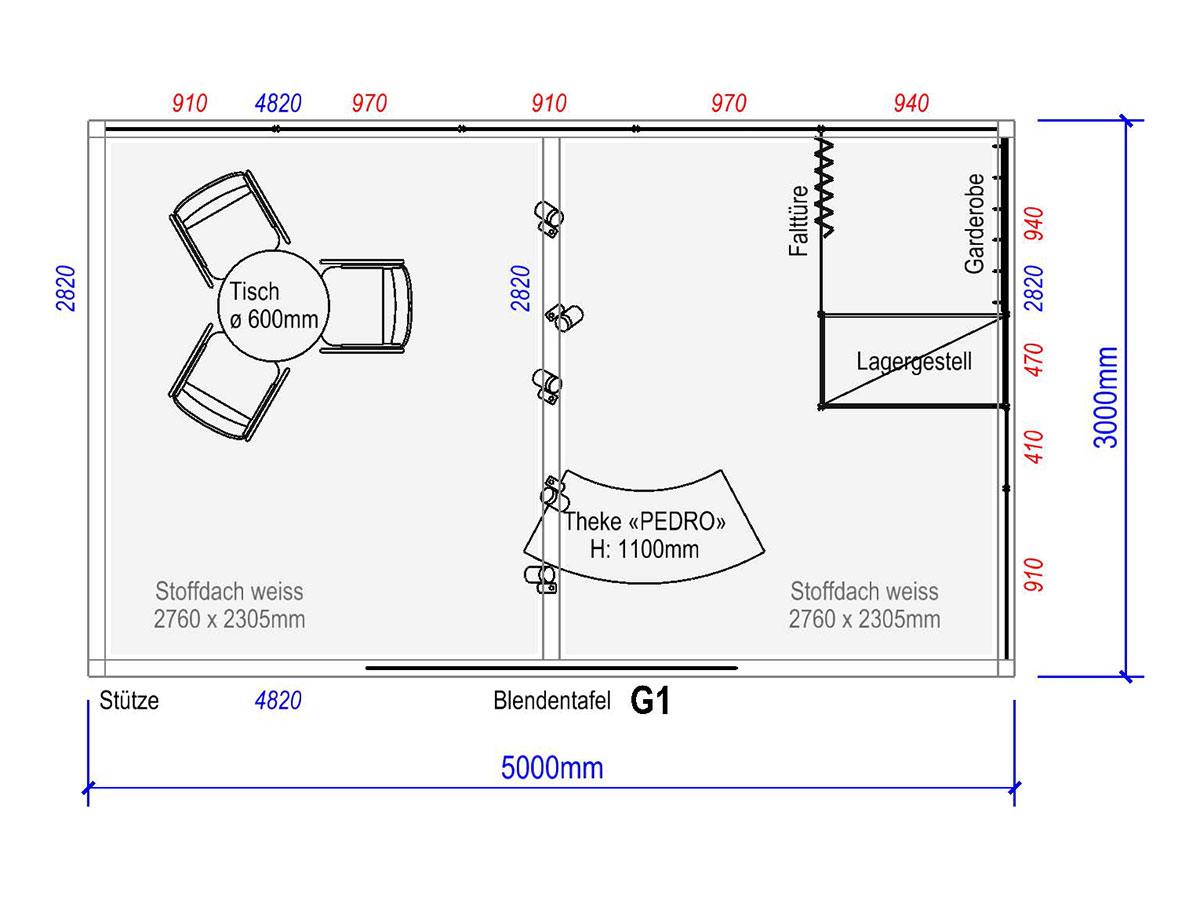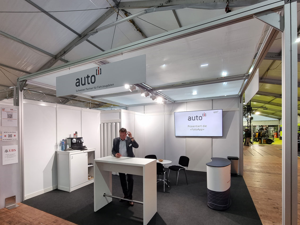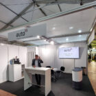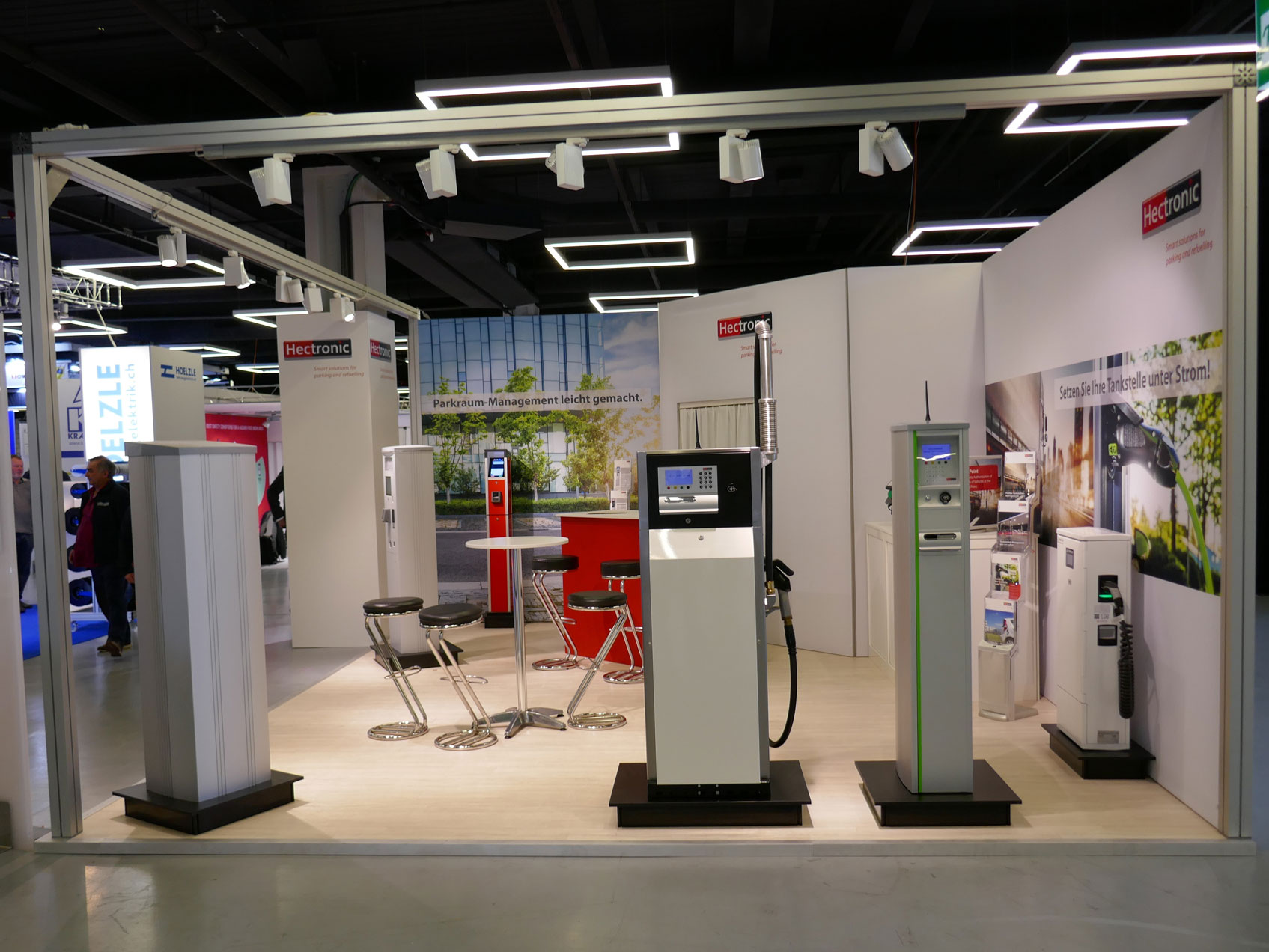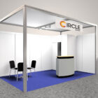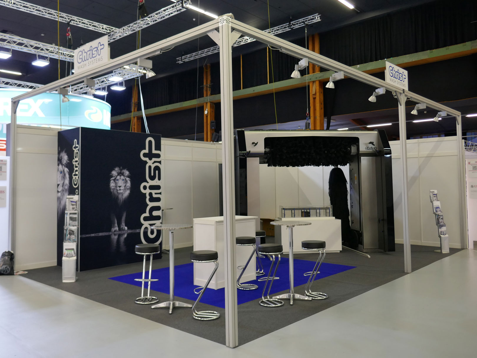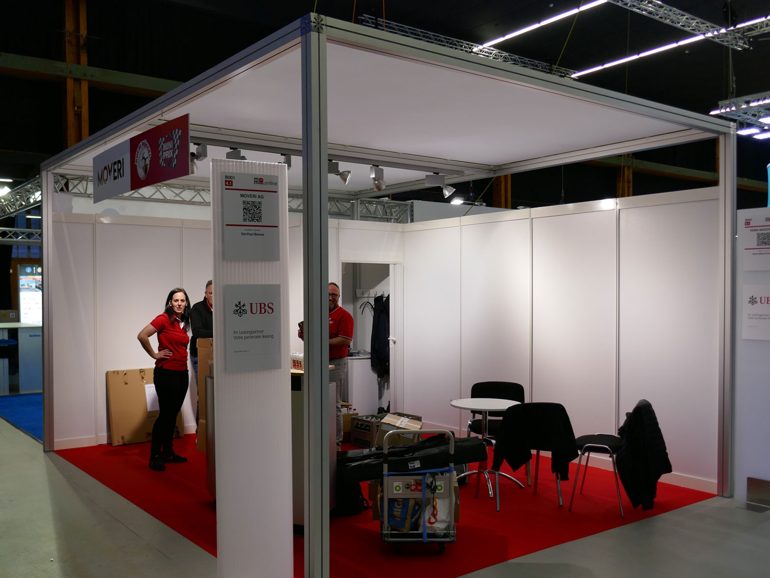 System und Wandelemente in weiss / Teppich Farbe nach Wahl, siehe unter Bodenbeläge / Wandelemente OK 250cm, Blenden- und Deckenstruktur System Alu, OK: 300cm / Decke in Stoff weiss / Kabine 1.5m², mit Falttür abschliessbar / Lagergestell AN705 mit 5 Tablare / Wandgarderobe AN715 mit 5 Kleiderbügel / Theke Pedro, silber AN606, Höhe 110cm / Tisch-Rund 60cm, weiss AN810, Höhe 74cm / Besprechungs-Stuhl, anthrazit AN856, 3 Stück / Beleuchtung HQI-Spot 70/350W (1 Stk. pro 3m² Standfläche) / Blendentafel weiss mit Ihrem Original-Logo, 200x40cm